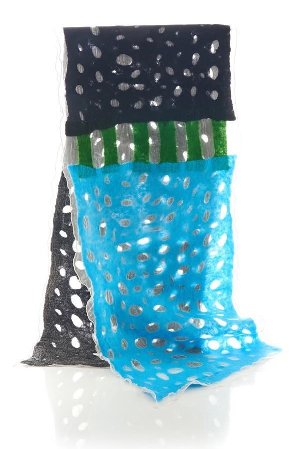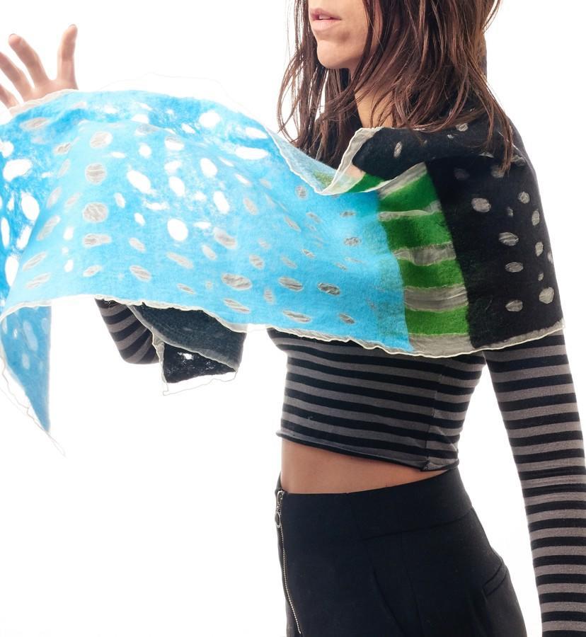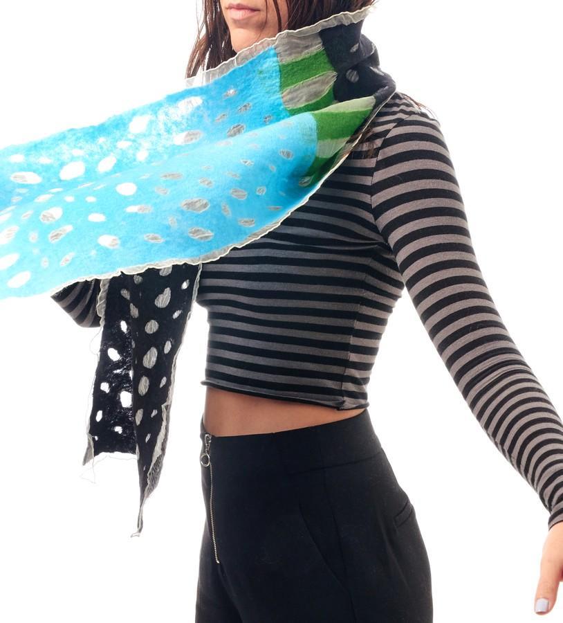 Handmade silk organza scarf of merino wool made by hand with Nuno Felting technique. In black/forest green/blue lagoon.