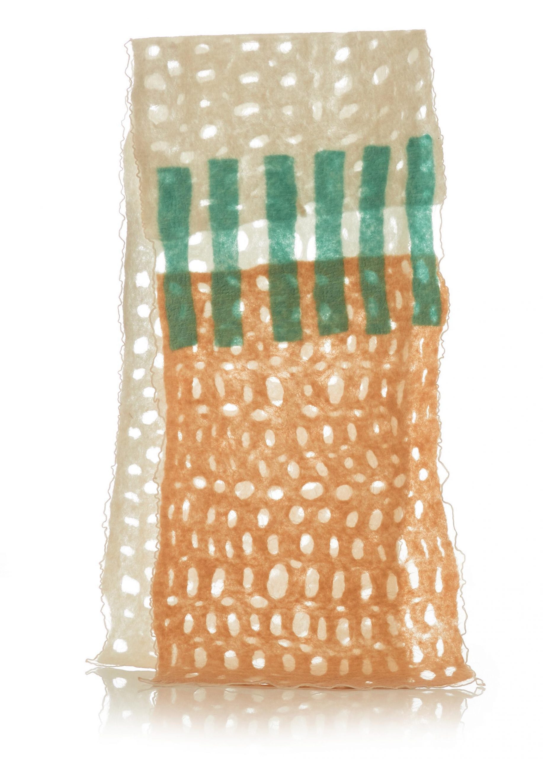 Handmade silk organza scarf of merino wool with Nuno Felting technique. In beige/white/vert amande.
